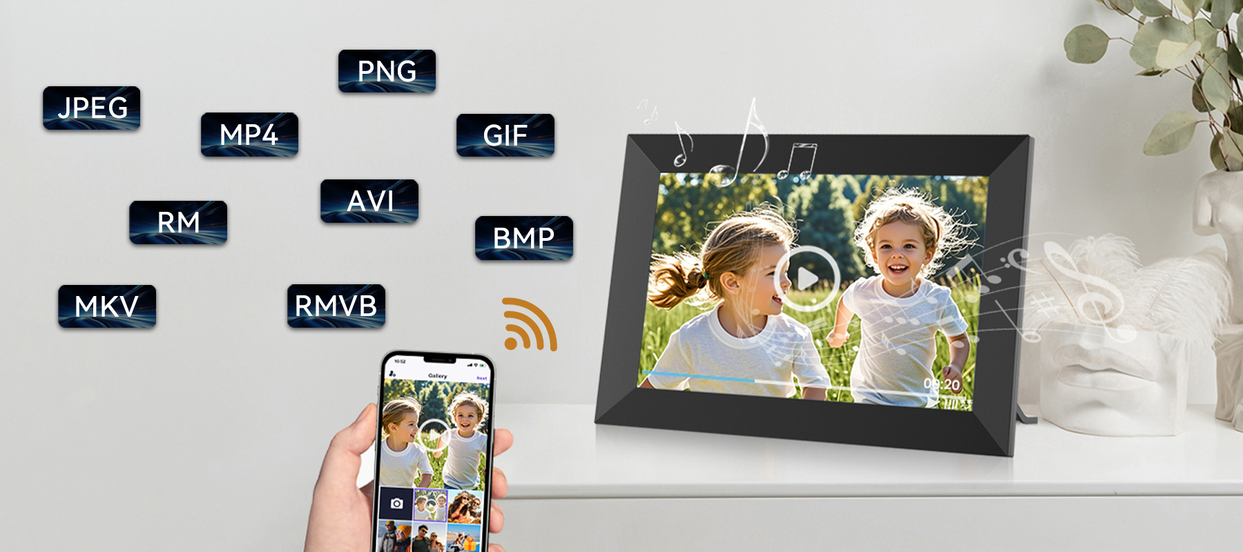 Gjør lysbildefremvisningene dine mer dynamiske. Valis smart foto-ramme støtter HD videoavspilling og bytter automatisk mellom bilder og videoer på en jevn og sømløs måte. Det er den perfekte blandingen av et fotos statiske skjønnhet og en videos dynamiske energi, som gir deg et komplett audiovisuelt festmåltid.