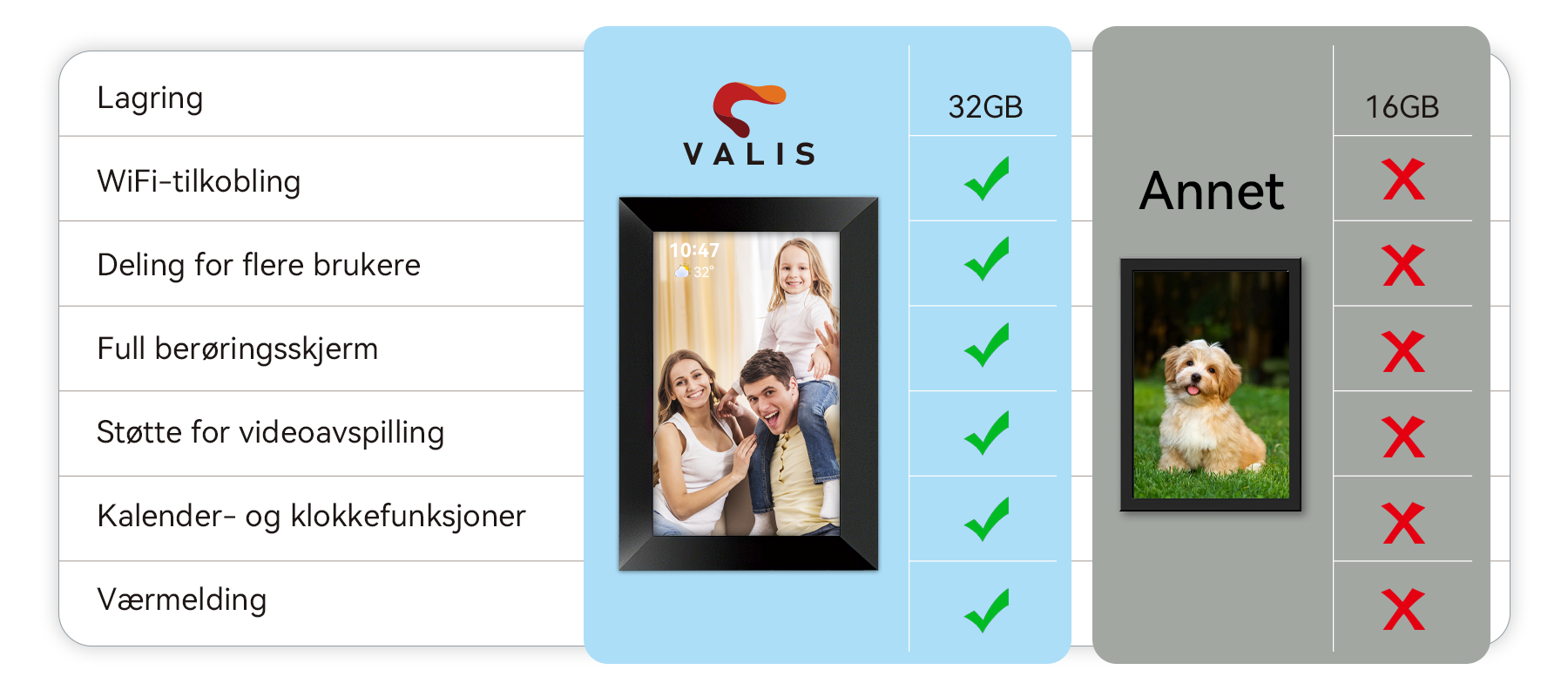 Valis smart foto-ramme er et smart hjem for hjemmet ditt. Den kombinerer klokke, kalender og sanntid værvisning med en levende bildeslideshow. Med et enkelt trykk kan du "like" bilder for å dele din kjærlighet, og gjøre hvert minne til et interaktivt, hjertevarmt øyeblikk.