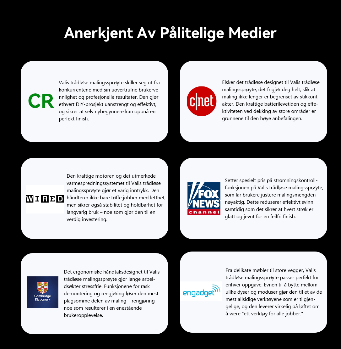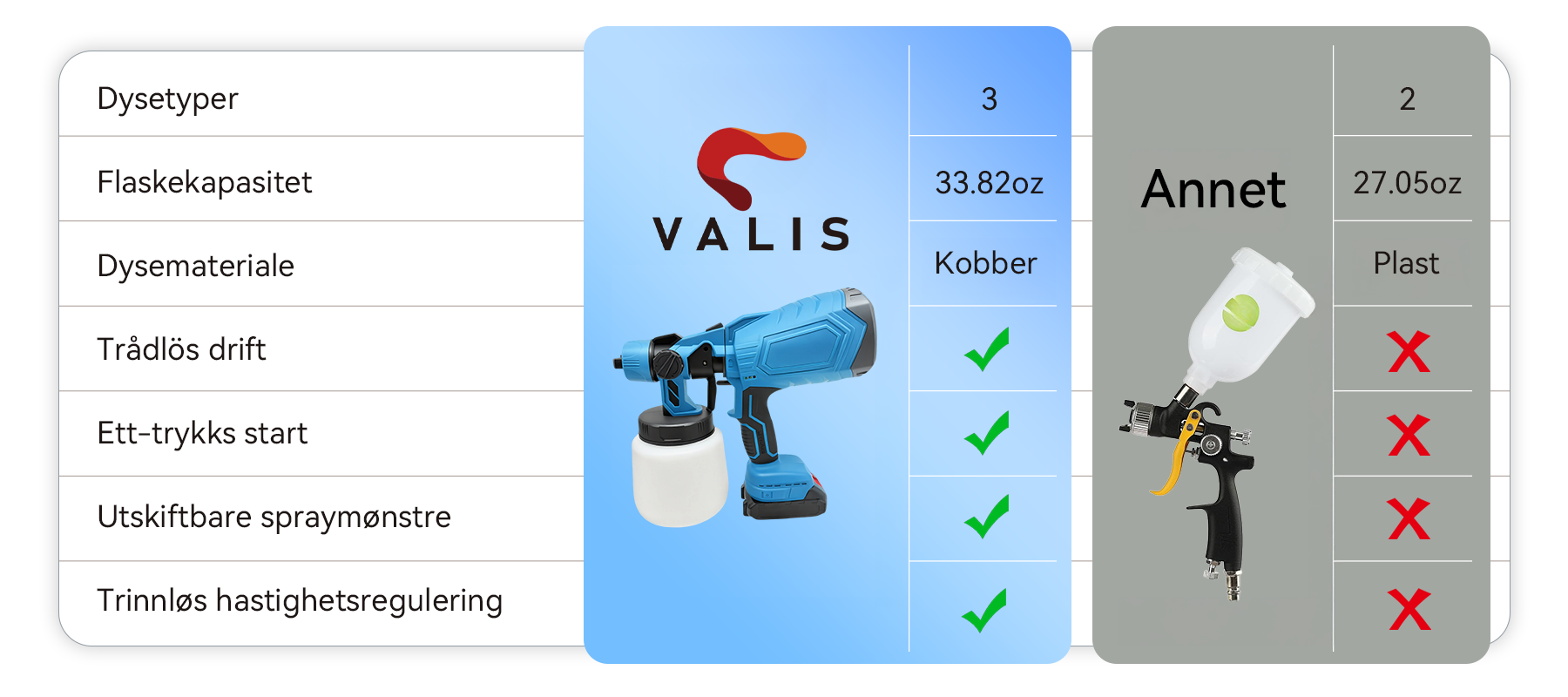 Slik ble Valis Trådløs Malingssprøyte født. Den kraftige, men brukervennlige designen gjør at malingen går lekende lett, samtidig som den leverer feilfrie resultater. Dette reflekterer Valis sitt kjerne løfte: Å gjøre kjedelige oppgaver om til en kreativ glede, slik at du kan fokusere på kunsten i ditt arbeid.