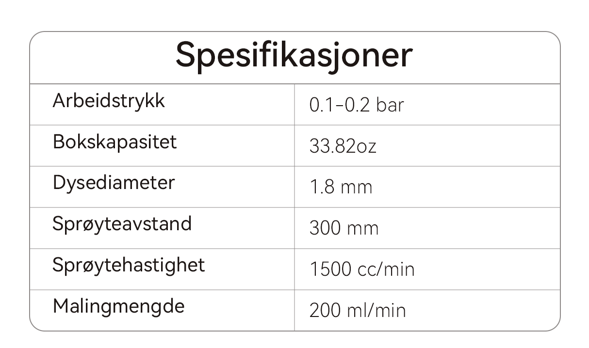 Få profesjonelle resultater med presis kontroll over malingsstrømmen og sprøytemønstre. Dette verktøyet sikrer at hvert strøk er jevnt og glatt, noe som gjør det perfekt for detaljerte prosjekter som fin møbelproduksjon, modeller eller kunst for å gi arbeidet ditt en feilfri finish.