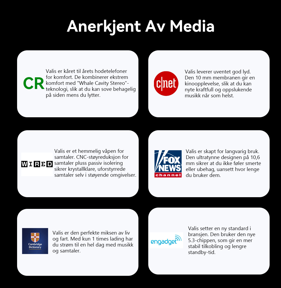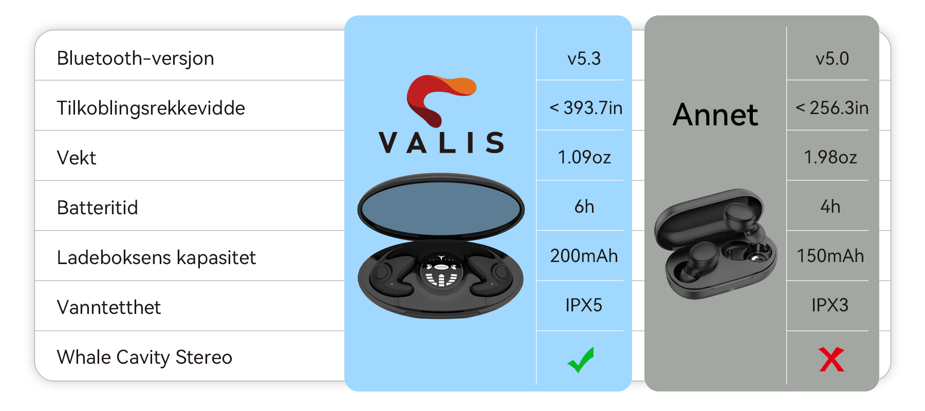 Takket være den nyoppgraderte IPX5 vanntette teknologien får du profesjonell beskyttelse. Enten det er tung svette eller et uventet regnskyll, skraper Valis av fuktigheten og sprutene. Dette garanterer høy holdbarhet, og lar deg bruke dem med tillit i ethvert miljø og kontinuerlig nyte en ren lydopplevelse.